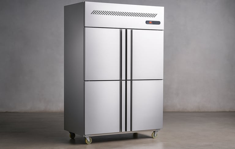 Designed for efficiency and convenience, this stainless steel four-door refrigerator provides ample storage with organized compartments, advanced cooling technology, and smooth mobility on caster wheels perfect for high-demand environments.