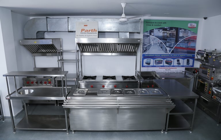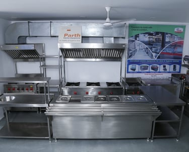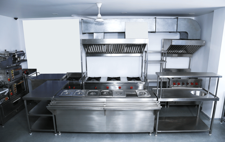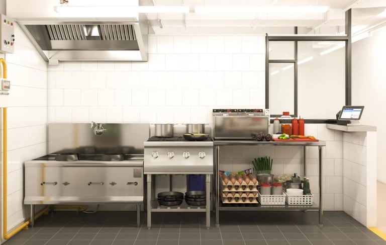 Optimized for space and workflow, this compact kitchen setup includes stainless steel counters, high-rise shelves, and wall-mounted hoods engineered for cloud kitchens and quick service models.