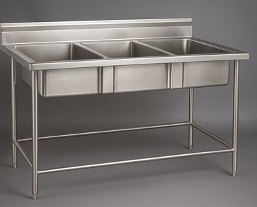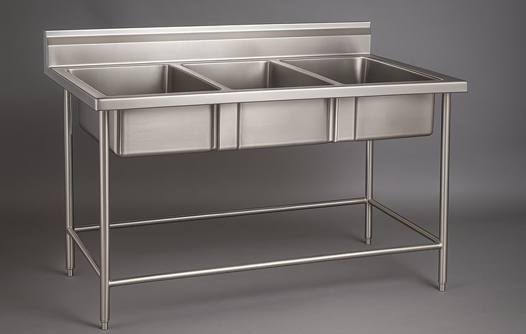 A heavy-duty stainless steel three-compartment sink designed for efficient dishwashing and sanitizing in commercial kitchens. Ideal for separating washing, rinsing, and sanitizing tasks, ensuring hygiene compliance and streamlined operations.