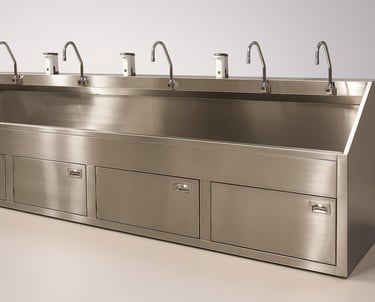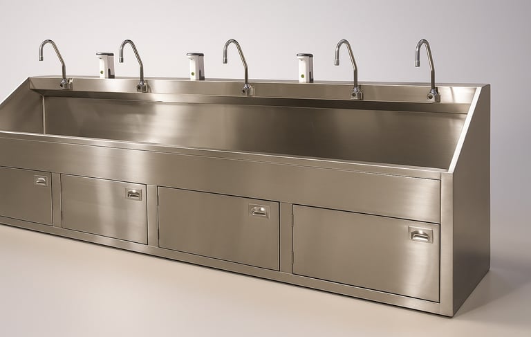 A heavy-duty scrub station designed for medical and food-grade environments. Constructed entirely from high-grade stainless steel, it features dual sink compartments, integrated taps, and enclosed under-sink storage. The slanted front and backsplash provide a hygienic and splash-proof design for optimal cleanliness and user comfort.