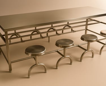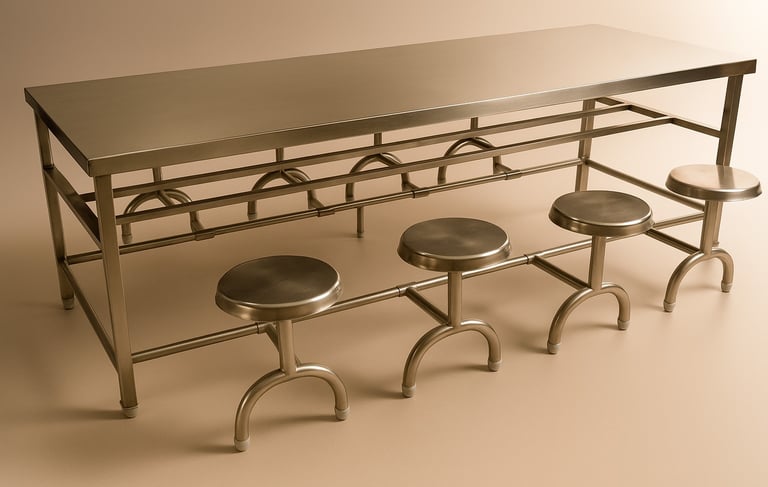A sturdy, space-saving dining solution ideal for canteens, cafeterias, and institutional kitchens. This table features a stainless steel top with ergonomically attached round stools, ensuring durability, easy maintenance, and optimized seating arrangement for up to 8 persons.