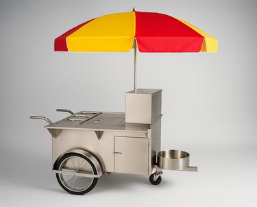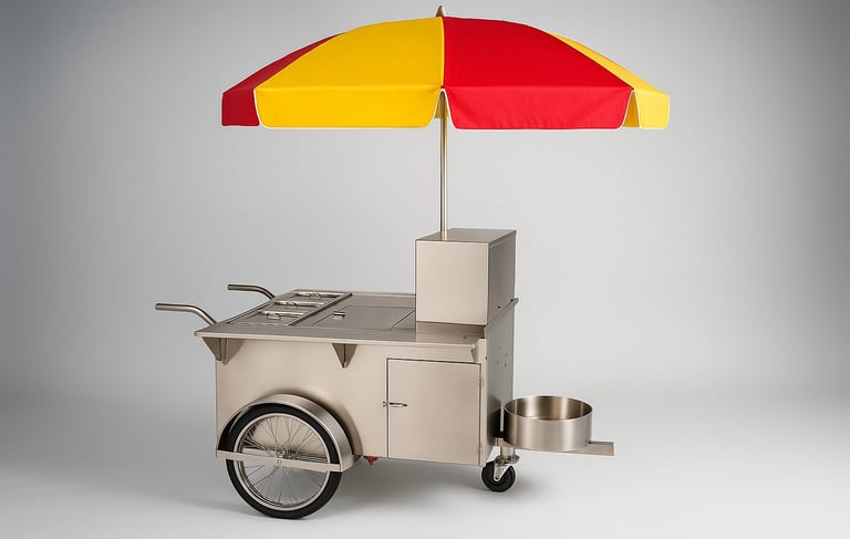 A compact and mobile stainless steel hot dog trolley, ideal for street food vendors and catering businesses. This unit features integrated compartments for steaming or heating hot dogs, storing buns, and organizing condiments. The robust design includes a chimney, enclosed storage cabinet, and utensil holders, all mounted on durable wheels for smooth portability. Its ergonomic handles ensure easy maneuvering, making it a practical solution for on-the-go food service.