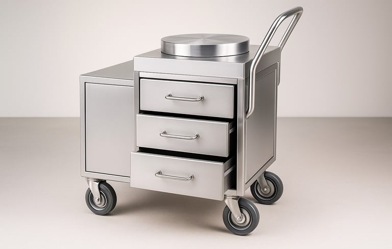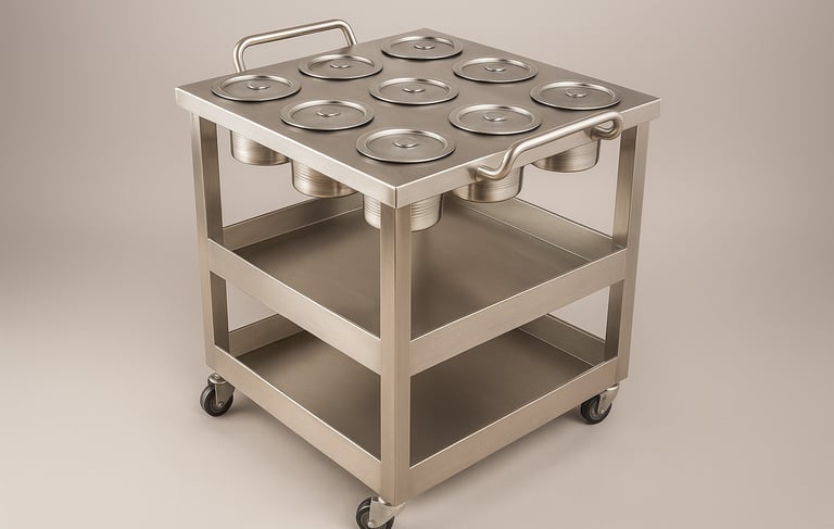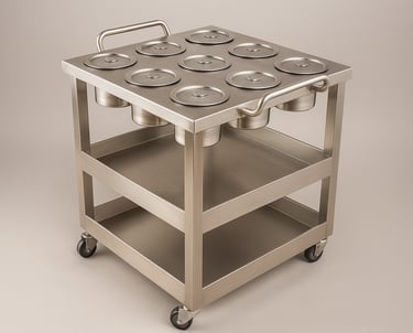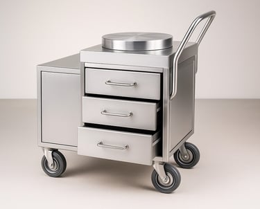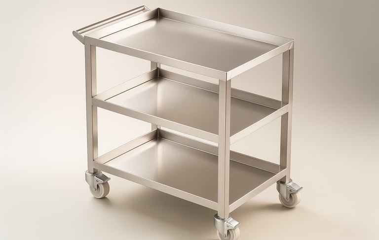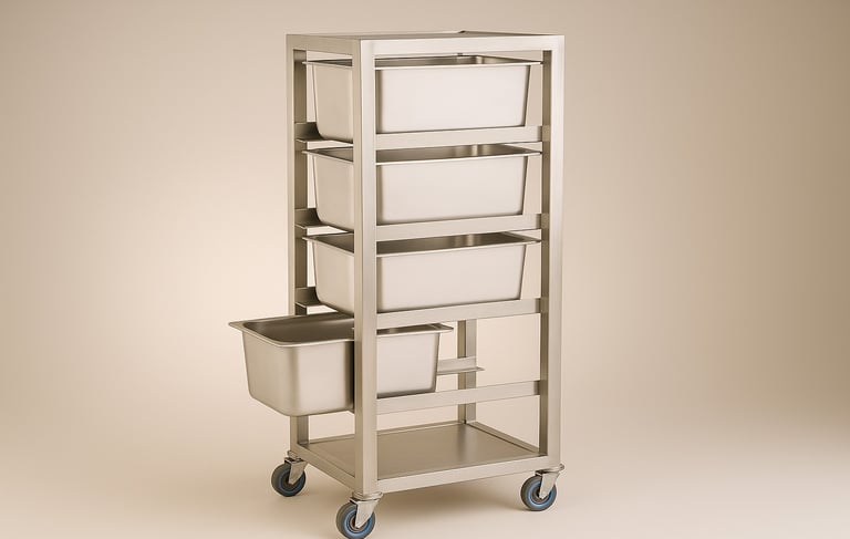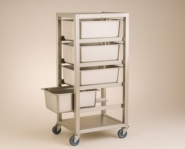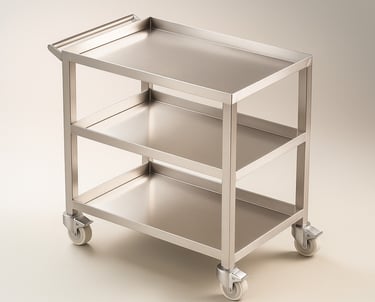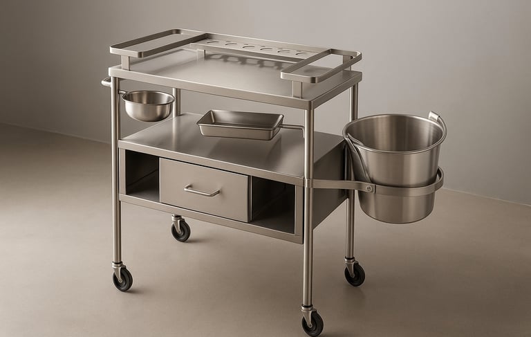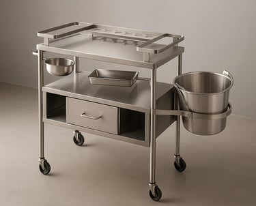 A multi-purpose stainless steel instrument trolley designed for hospitals, laboratories, and food service environments. This unit features a sturdy frame with smooth-rolling caster wheels for mobility, multiple utility trays for organized storage, and side-mounted containers for additional convenience. The integrated drawer provides secure storage for tools and accessories. Its hygienic and easy-to-clean surface makes it ideal for sterile and demanding workspaces.